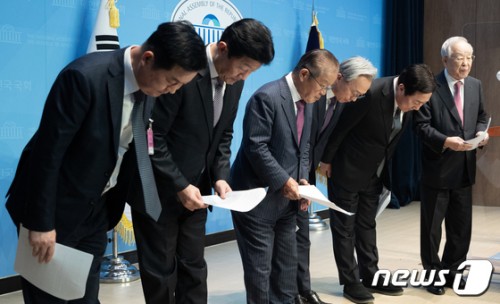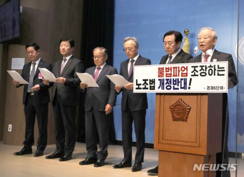 경제단체장들이 20일 오후 서울 여의도 국회 소통관에서 노조법 개정 논의 중단 촉구 긴급기자회견을 하고 있다. 오른쪽부터 손경식 한국경영자총협회장, 김기문 중소기업중앙회장, 최진식 중견기업연합회장, 권태신 전국경제인연합회 상근부회장, 우태희 대한상공회의소 상근부회장, 김고현 한국무역협회 전무.