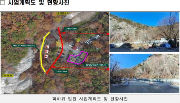 ○ (사업배경) 공원 주진입부 낙석위험구간*에 대한 대응 대책으로 우회로를 조성하여 안전사고 원천적 예방