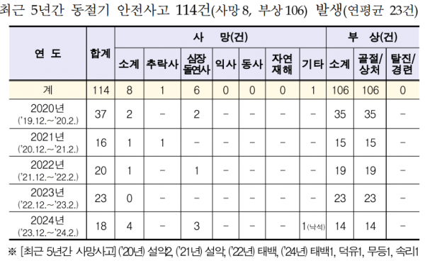 국립공원에서 동절기(12월~2월)에는 연평균(최근 5년간) 23건의 크고 작은안전사고가 발생하고 있다.
