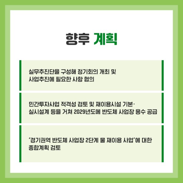 협약체결 이후 이번 사업은 민간투자사업 적격성 검토 및 재이용시설 기본·실시설계 등을 거쳐 2029년도에 반도체 사업장에 용수를 공급할 계획이다.