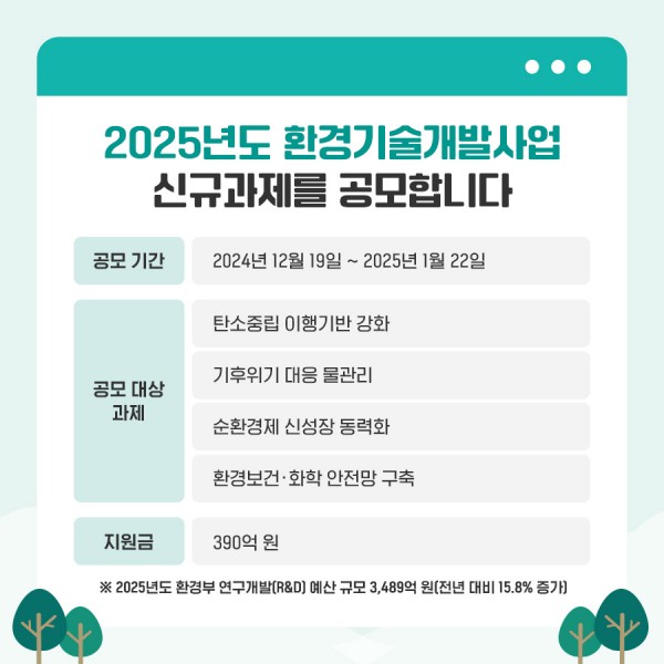 환경부(장관 김완섭)는 탄소중립과 지속가능한 환경기술 개발을 위해 오는 12월 19일부터 내년 1월 22일까지 ‘2025년도 환경기술개발사업 신규과제’를 공모한다.