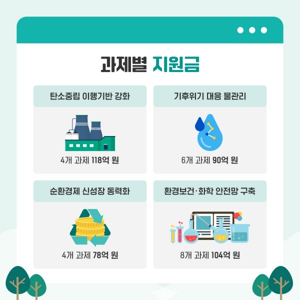 이번 공모의 대상 과제는 △탄소중립 이행기반 강화, △기후위기 대응 물관리, △순환경제 신성장 동력화, △환경보건·화학 안전망 구축 등 4대 중점영역에 포함된