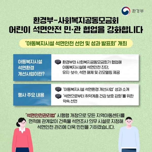 이날 환경부(한국환경공단)는 ‘아동복지시설 석면환경 개선사업’의 성과를 소개하고, 행사 참여 기관(사회복지공동모금회,
