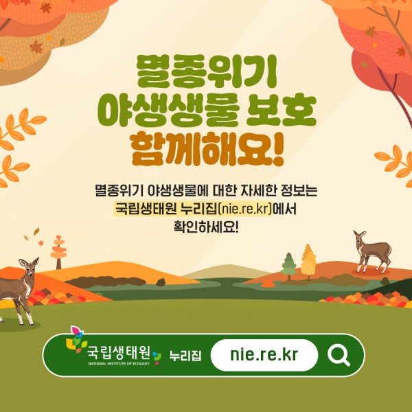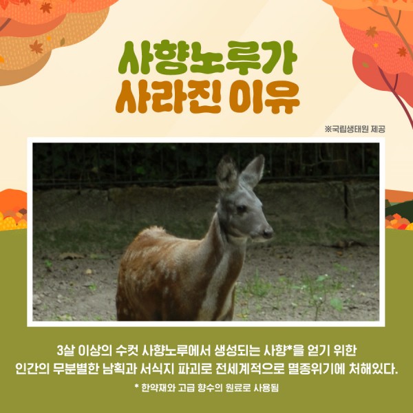 사향노루 등 멸종위기 야생생물에 대한 정보는 국립생물자원관 누리집(nibr.go.kr)과 국립생태원 누리집(nie.re.kr)에서 확인할 수 있다.