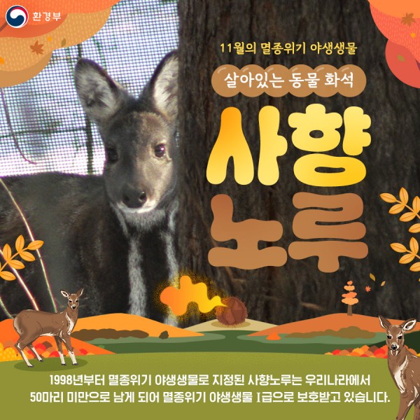 환경부(장관 김완섭)는 멸종위기 야생생물 I급인 사향노루를 11월 ‘이달의 멸종위기 야생생물’로 선정했다고 밝혔다.