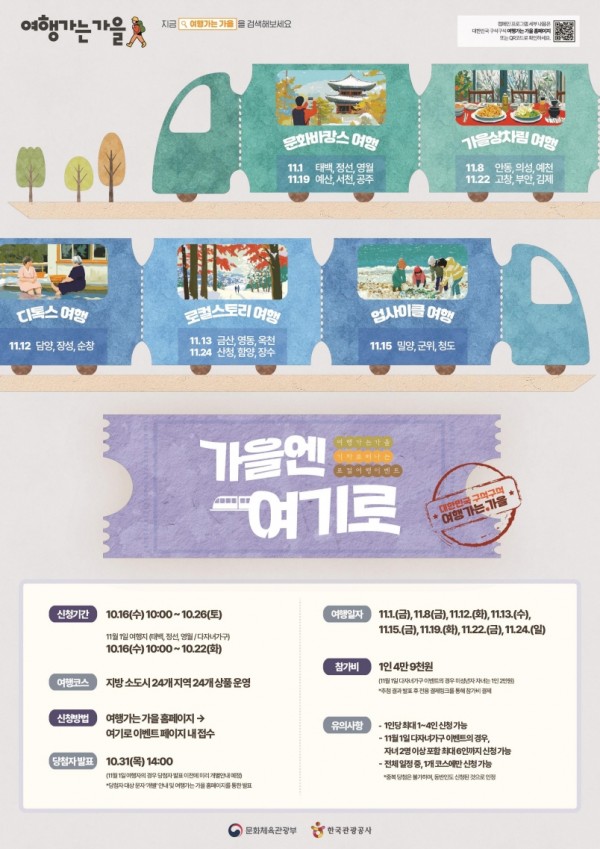 마련해 발표한 ’24년 4분기 국내관광 활성화 대책, ‘대한민국 구석구석, 여행가는 가을’ 대국민 여행캠페인의 일환이다. 여행 비수기인 11월,