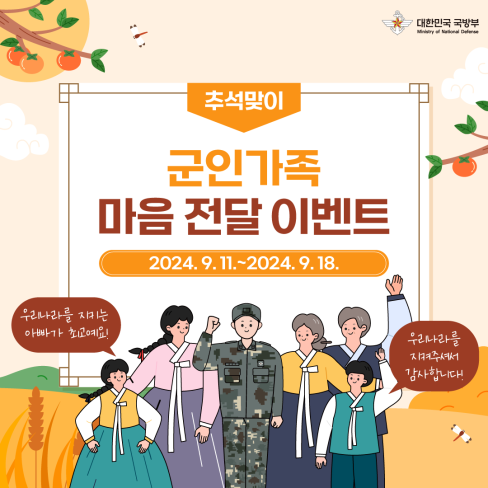 국방부 공식 SNS를 통해 ‘군인가족의 날 마음 전달 이벤트’(’24.9.11. ~ ’24.9.18.)를 진행하여, 군인과 군인가족에 대한 우리 국민의 관심과 사랑을 전하는