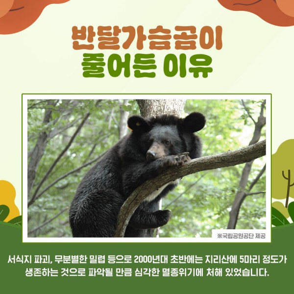 가까운 시일 내 국내에서 멸종할 것으로 판단하고 2004년부터 지리산 권역에 본격적인 반달가슴곰 증식·복원 사업을 추진했다.