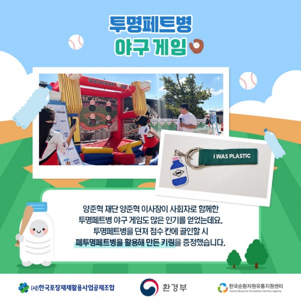 양준혁 재단 양준혁 이사장이 사회자로 함께하면서 투명페트병을 던져 점수 칸에 골인할 시 폐투명페트병을