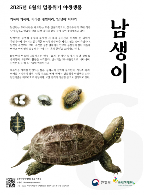 환경부(장관 김완섭)는 6월 ‘이달의 멸종위기 야생생물’로 우리나라 민물 거북이인 ‘남생이’를 선정했다고 밝혔다.