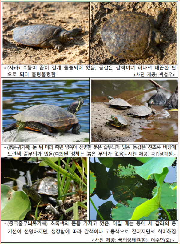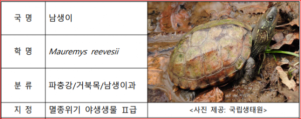 남생이 등 멸종위기 야생생물에 대한 정보는 국립생물자원관 누리집(nibr.go.kr)과 국립생태원 누리집(nie.re.kr)에서 확인할 수 있다.