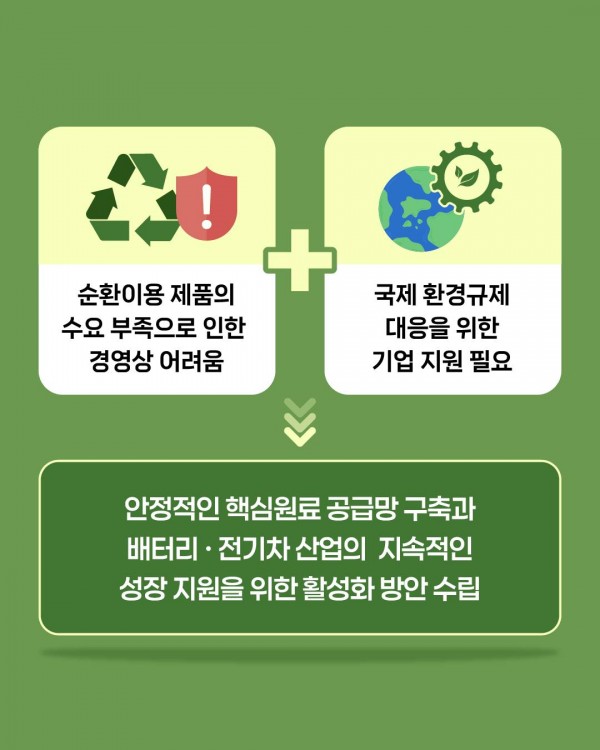 그간 업계는 재생원료, 재사용 제품 등 순환이용 제품의 수요 부족으로 인한 경영상 어려움과 유럽연합(EU) 배터리법* 등 국제사회의 환경규제 대응을 위한 지원 필요성을