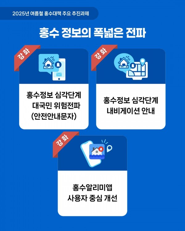 안전안내문자(CBS), 내비게이션 안내 개선 등 홍수정보의 일제 전파. 취약지역 및 홍수 위험요소에 대한 점검 및 관리 등 선제적대비 강화
