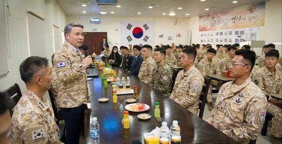 그는 전체 장병들과 가진 간담회에서 "이역만리 타국에서 모든 장병들의 헌신에 최고의 찬사를 보낸다"며 "여러분의 땀방울이 대한민국과 UAE 간 신뢰와 협력의 상징이 되고 있다"라고 말했다.