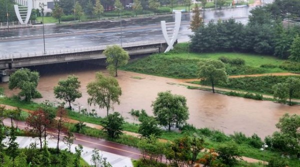 10일 새벽 대전지역에 쏟아진 폭우로 서구·유성구 일대 도안신도시를 관통하는 진잠천 산책로가 물에 잠겼다.