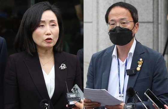 '검수완박' 권한쟁의심판 공개변론 날 헌법재판소 앞에서 전주혜 국민의힘 의원과 박주민 더불어민주당 의원.
