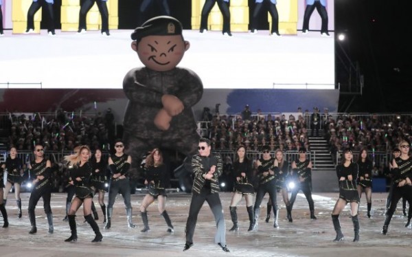 2018년 10월 1일 서울 용산구 전쟁기념관에서 열린 제70주년 국군의 날 기념식에서 가수 싸이가 공연을 하고 있다. 당시 행사는 저녁(오후 6시 반)에 시가행진, 열병식도 생략한 채 진행됐다.