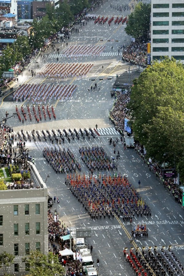 2013년 10월 1일 제65주년 국군의 날에 서울 중구 태평로에서 군 장병들의 시가행진이 펼쳐지고 있다. 행진엔 병력 4500여 명, 기계화부대 차량 등 37종 105대의 장비가 참여했다. 특히 당시 비공개 무기였던 탄도미사일 ‘현무2’, 순항미사일 ‘현무3’ 등도 공개됐다.