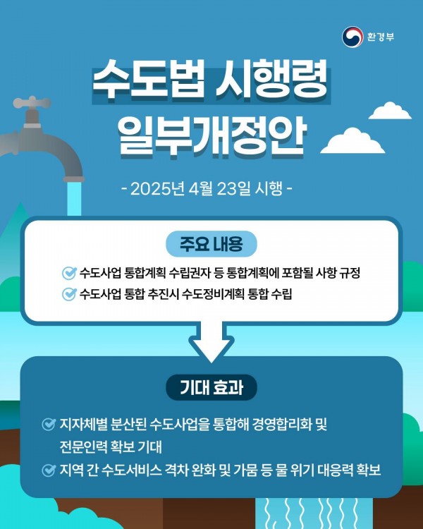 환경부(장관 김완섭)는 ‘물의 재이용 촉진 및 지원에 관한 법률(이하 물재이용법)’ 시행령 및 시행규칙 개정안을 4월 18일부터 40일간 입법예고 한다고 밝혔다.