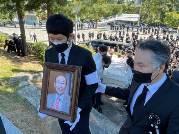 유족 대표가 18일 조용기 목사의 영정을 들고 경기도 파주 오산리최자실기념금식기도원 공원묘지로 향하고 있다.
