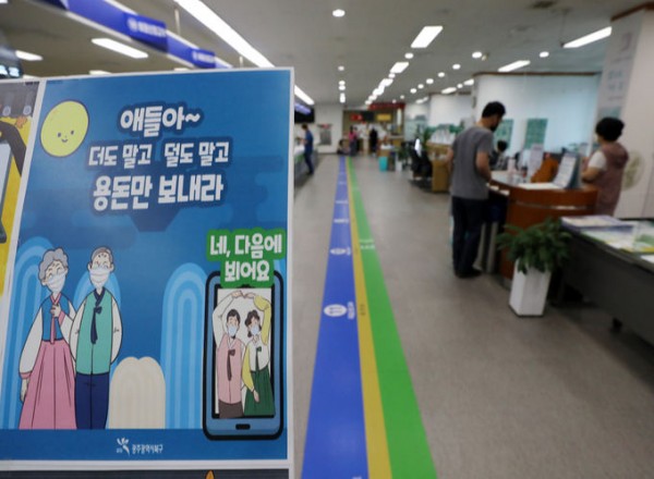 추석 명절 연휴를 나흘 앞둔 14일 오후 광주 북구청 민원실에 명절 연휴 기간 코로나19 확산 방지를 위해 고향 방문 자제를 부탁하는 홍보물이 설치돼 있다.