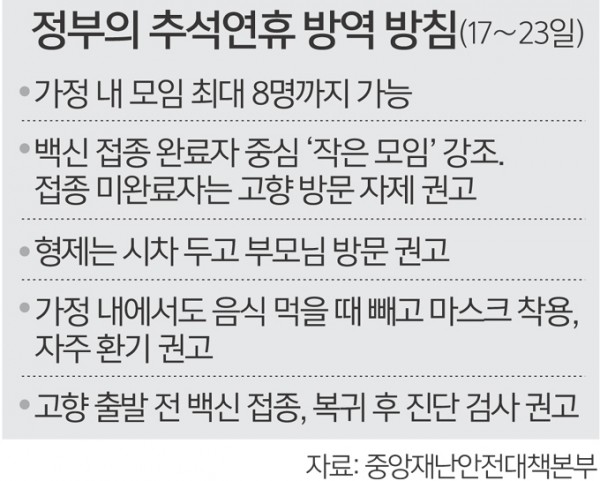 이번 추석 연휴기간 정부의 방역대책 기본 방향은 ‘출발 전 예방접종, 복귀 후 진단검사, 이동 시에는 방역·안전 최우선’이다. 지난 설 연휴(수도권 2.5단계, 비수도권 2단계) 당시 정부는 전국적으로 ‘5인 이상 사적 모임 금지’를 적용하면서 직계가족도 5인 이상 모일 수 없다며 고향 방문 자제를 강하게 권고했다.