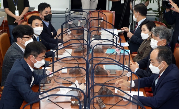 언론중재 및 피해구제 등에 관한 법률(언론중재법) 개정안을 논의 중인 여야 8인 협의체의 첫 회의가 지난 8일 국회 운영위 소회의실에서 열리고 있다.