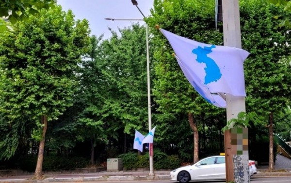 경기도 안양시 도로에 한반도기가 펄럭이고 있다. 안양시는 광복절을 맞아 한반도의 평화통일을 기념하기 위해 안양중앙공원 일대에 태극기 대신