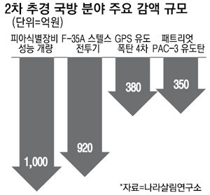 이 밖에도 △지상 전술 C4I 체계 2차 성능 개량 △위성위치확인시스템(GPS) 유도폭탄 4차 △패트리엇 성능 개량 등 국방 전력 강화를 위한 사업 예산이 줄줄이 감액됐다.