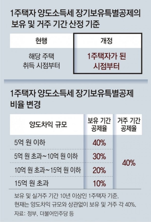 그 대신 12억 원 초과 주택에 대해선 장특공제 요건이 까다로워진다. 장특공제는 1주택 장기보유자에게 보유 및 거주 기간에 따라 최대 40%씩, 총 80%까지 양도세를 공제해주는 제도다.