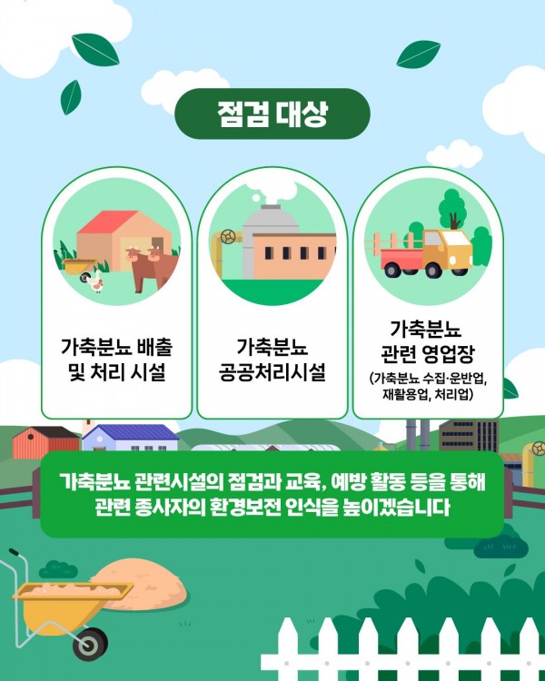 이번 지도·점검은 4월 1일부터 6월 30일까지 △가축분뇨 배출 및 처리 시설, △가축분뇨공공처리시설, △가축분뇨 관련 영업장(가축분뇨 수집·운반업, 재활용업, 처리업)