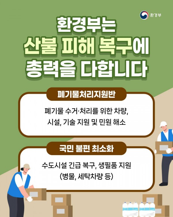 환경부(장관 김완섭)는 울산·경북·경남 산불의 영향으로 발생한 재난 폐기물을 신속하게 처리하고 있으며, 안전한 수돗물 공급을 위한 복구 지원도