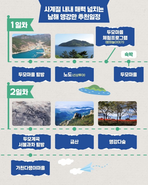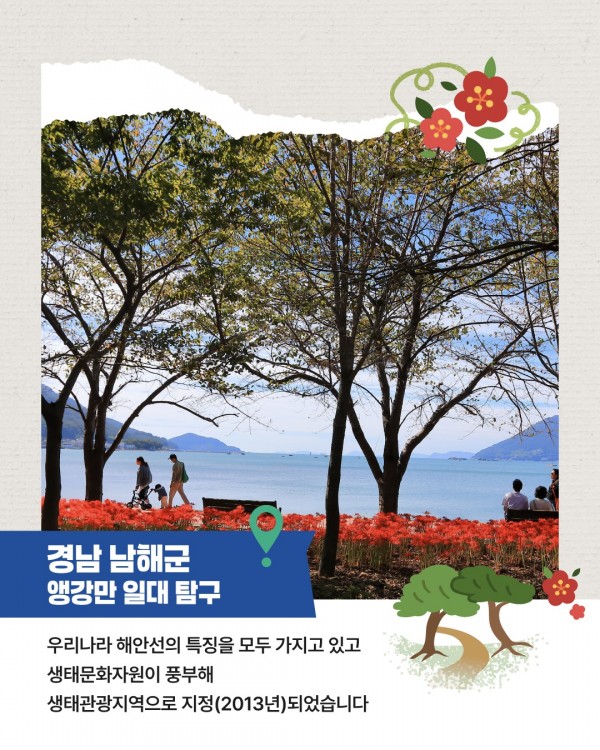 자연과 문화가 가득한 남해의 생태관광 정보와 연계 방문 가능한 지역 관광명소, 추천 여행일정은 환경부 ‘우리나라 생태관광 이야기’ 누리집(eco-tour.kr)에서 확인할 수 있다.