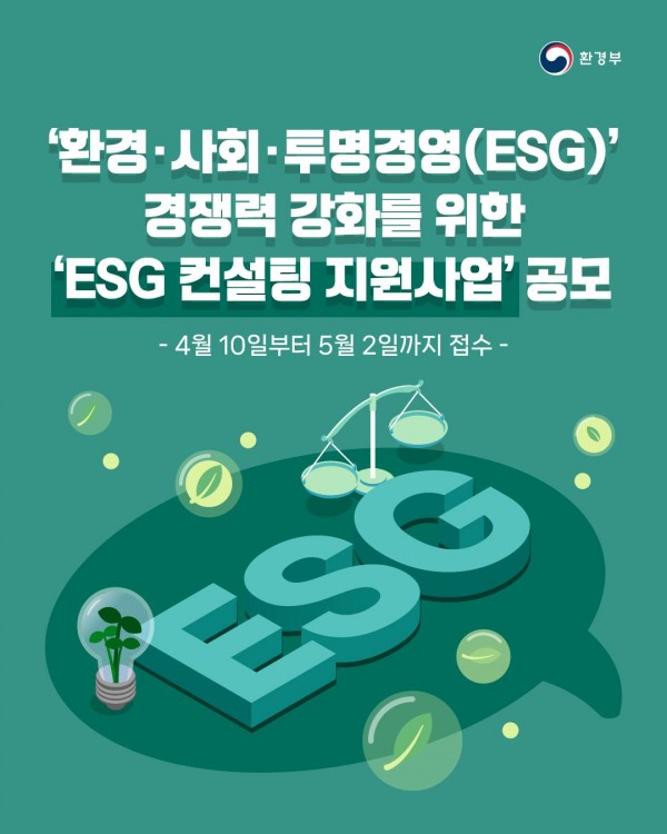 환경부(장관 김완섭)와 한국환경산업기술원은 중소·중견기업의 ‘환경·사회·투명 경영(ESG)’ 경쟁력 강화를 위한 ‘친환경경영(ESG) 상담(컨설팅) 지원사업’을