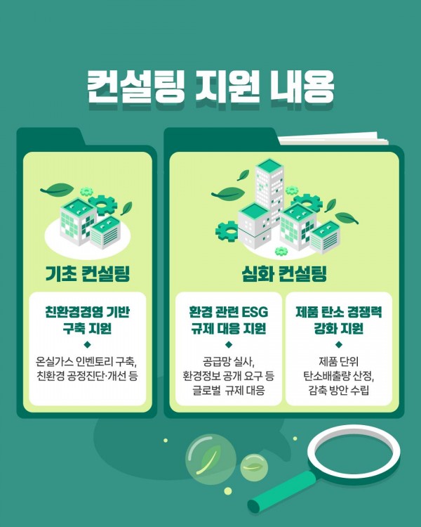 이 사업은 기업의 ‘환경·사회·투명 경영’에 대한 기본기를 다지는 ‘기초 컨설팅’과 공급망 실사와 같은 구체적인 국제 환경규제별 대응 방법과 제품 단위의 탄소