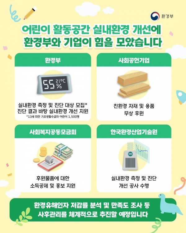 박연재 환경부 환경보건국장은 “이번 협약으로 정부의 정책에 기업의 지원이 더해져 어린이가 쾌적하고 건강한 환경에서 생활하는 데에 실질적인 도움이 될 것”이라며,