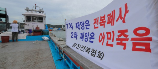 강진전복협회 어민들이 14일 강진 마량 앞바다의 한 어선에 전복 피해를 호소하며 "1차 재앙은 전복폐사, 2차 재앙은 어민죽음" 현수막을 내걸었다.