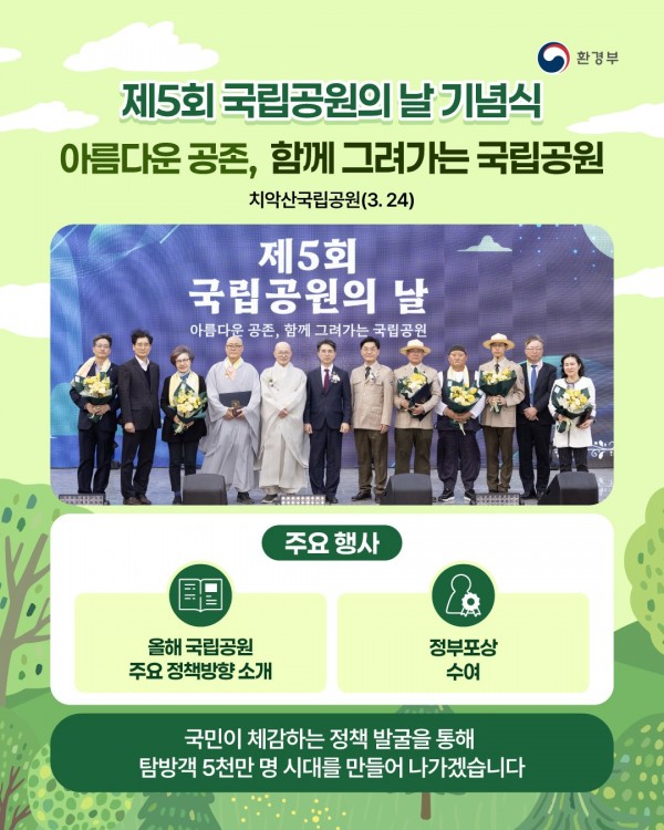 환경부(장관 김완섭)와 국립공원공단(이사장 주대영)은 3월 24일 오후 치악산국립공원 구룡사(강원특별자치도 원주시 소재)에서 ‘제5회 국립공원의 날