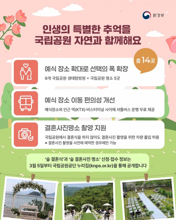 환경부(장관 김완섭)와 국립공원공단(이사장 주대영)은 예비부부와 결혼사진 촬영을 희망하는 국민을 대상으로 3월 초부터 국립공원 ‘숲 결혼식’을 대폭 확대하고