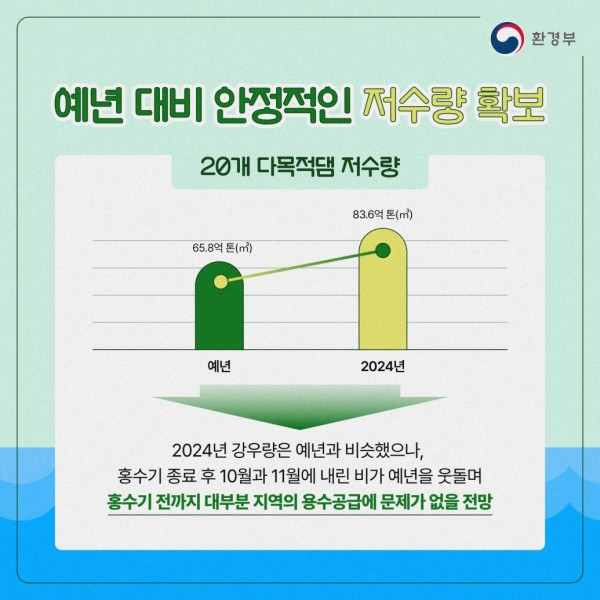 또한, 2022~2023년 극심한 가뭄이 발생했던 섬진강 권역의 주암댐(예년의 148%)과 섬진강댐(예년의 112%)도 예년보다 많은 저수량을 확보하고 있으며,