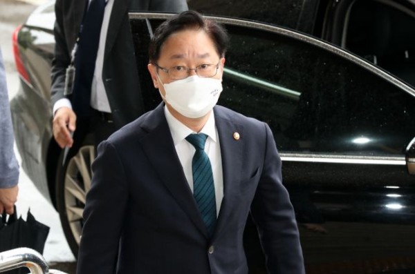 박범계 법무부 장관이 29일 오전 경기도 과천시 정부과천청사 법무부로 출근하고 있다.