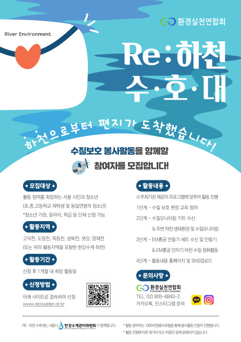 서울시 한강수계관리위원회 지원으로 진행되는 Re: 하천 수호대는 River Environment의 약자로, ‘우리 하천에 깨끗한 환경을 다시 돌려주자’는 마음으로 활동에 참여하는 시민을 뜻한다.