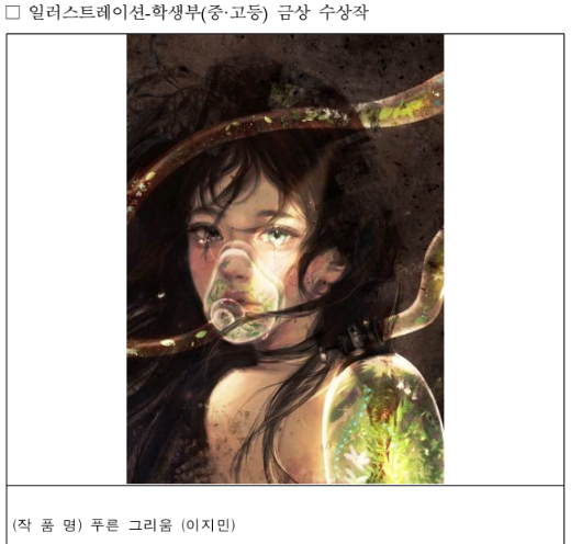 보존하자는 주제를 표현해 주목받았다. 일러스트레이션 학생부 최고상인 금상에는 중·고등분야 ‘푸른 그리움(이지민 작)’과 초등분야 ‘지구는