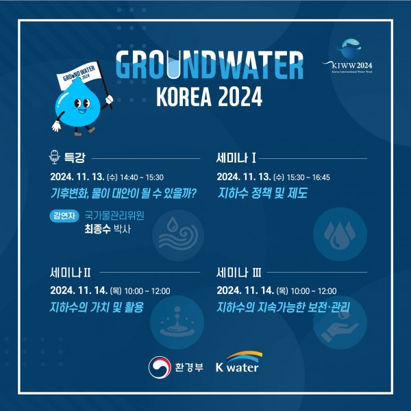 올해 행사는 같은 장소에서 열리는 ‘대한민국 국제물주간 2024’와 연계하여 열리며, 지하수 분야의 학계 및 산업계 전문가, 지자체 담당자 등 500여 명이 참석할 예정이다.