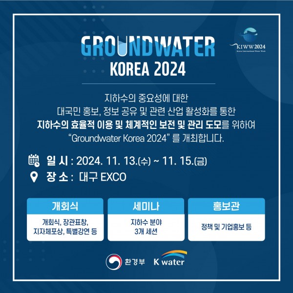 환경부(장관 김완섭)와 한국수자원공사(사장 윤석대)는 11월 13일부터 3일간 엑스코(대구시 북구 소재)에서 ‘그라운드워터 코리아 2024’를 개최한다고 밝혔다.