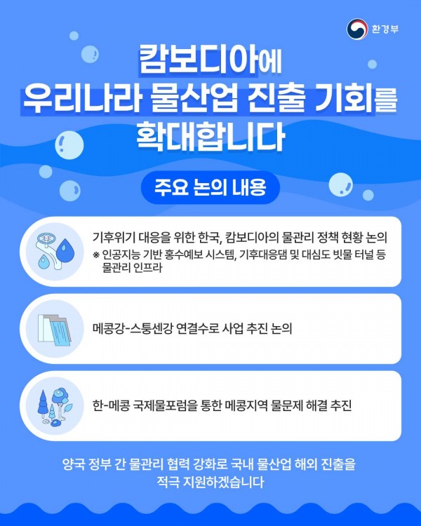 아울러 말레이시아 에너지수자원부, 헝가리 수도협회 및 물산업협의회, 베트남 상하수도협회 등 해외 정부 기관 및 단체에서도 우리나라 물산업 및 최신