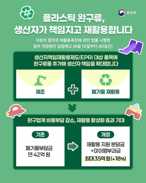 이번 개정안에 따라, 플라스틱 완구류를 제조·수입하는 사업자는 내년(2026년) 1월 1일부터 환경부가 매년 산정·고시하는 재활용의무율만큼 해당 품목을