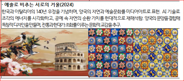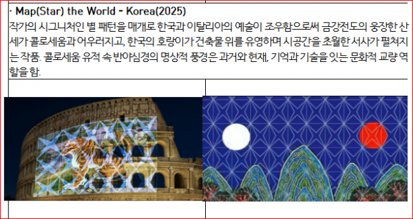 콜로세움 외벽에 투사했다. 십장생도와 양국의 전통 건축 패턴 등을 소재로 한 작품을 인공지능 기술로 정교하게 구현했다. 특히 6월 26일은 1884년에 조선과 이탈리아 왕국이