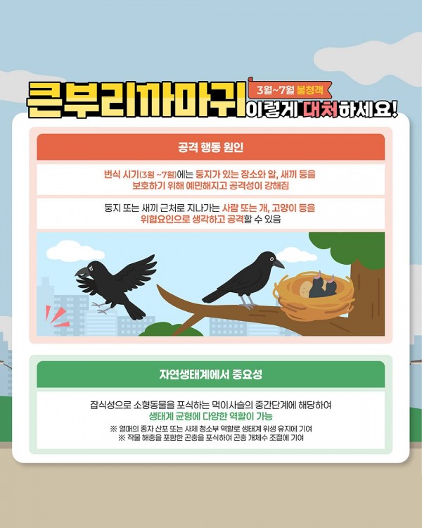 큰부리까마귀 둥지 근처 조심하세요… 안전 및 공존 위한 행동요령 안내