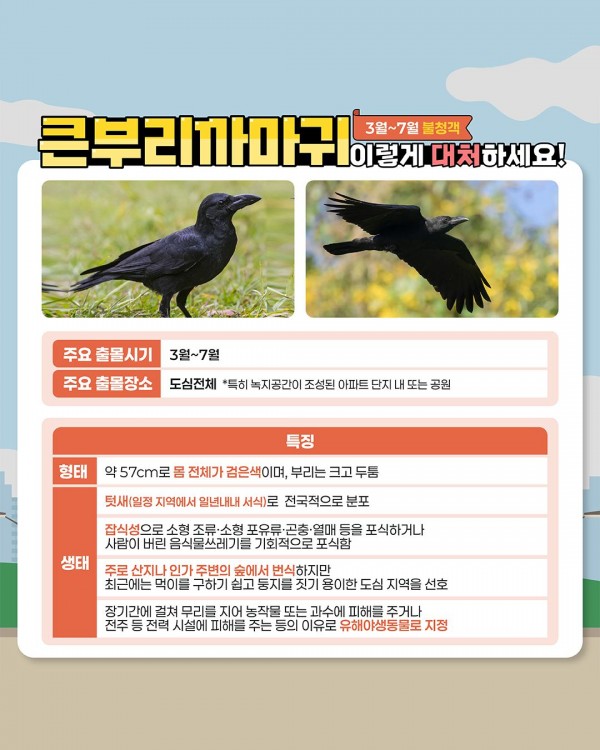 환경부는 지자체와 협조하여 도시에 서식하는 큰부리까마귀의 서식 실태 및 피해 현황을 조사하여 안내 표지판을 설치하는 등 국민 피해를 줄일 예정이다. 아울러 대응